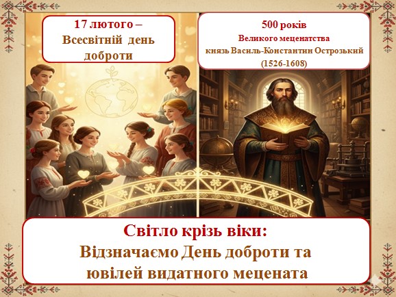 Цьогоріч День доброти набуває для нас особливого змісту. У 2026 році Україна та світ відзначають величний ювілей — 500 років від дня народження людини, чиє ім’я стало символом цілої епохи. Василь-Костянтин Острозький (1526–1608) довів: справжня велич вимірюється не кількістю золота, а кількістю заснованих шкіл та виданих книг. Обіймаючи найвищі посади у Великому князівстві Литовському — від маршалка Волинської землі до воєводи Київського, — він отримав титул «некоронованого короля Русі». Але маючи колосальні статки та політичний вплив, Острозький обрав шлях не лише війни, а й інтелектуального будівництва.