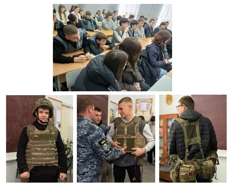 Студенти мали можливість приміряти бронежилет і шолом, оцінити вагу спорядження та дізнатися про правила його використання.